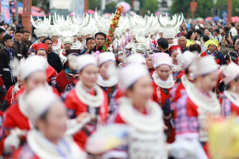 في الصور الملتقطة مواطنون محليون من قومية مياو في مراسم الاحتفال بعيد الأخوات التقليدي لقومية مياو في محافظة تايجيانغ بمقاطعة قويتشو في جنوب غربي الصين.