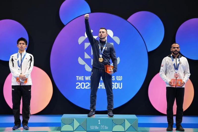 تشنغدو 10 أغسطس 2025 (شينخوا) في الصورة الملتقطة يوم 9 أغسطس 2025، اللاعب المصري الحاصل على الميدالية البرونزية عبد الله عبد العزيز (إلى اليمين)، يحضر حفل توزيع الجوائز لوزن تحت 75 كغم للكوميتية للرجال في منافسات الكاراتيه ضمن دورة الألعاب العالمية 2025 بمدينة تشنغدو، حاضرة مقاطعة سيتشوان جنوب غربي الصين.