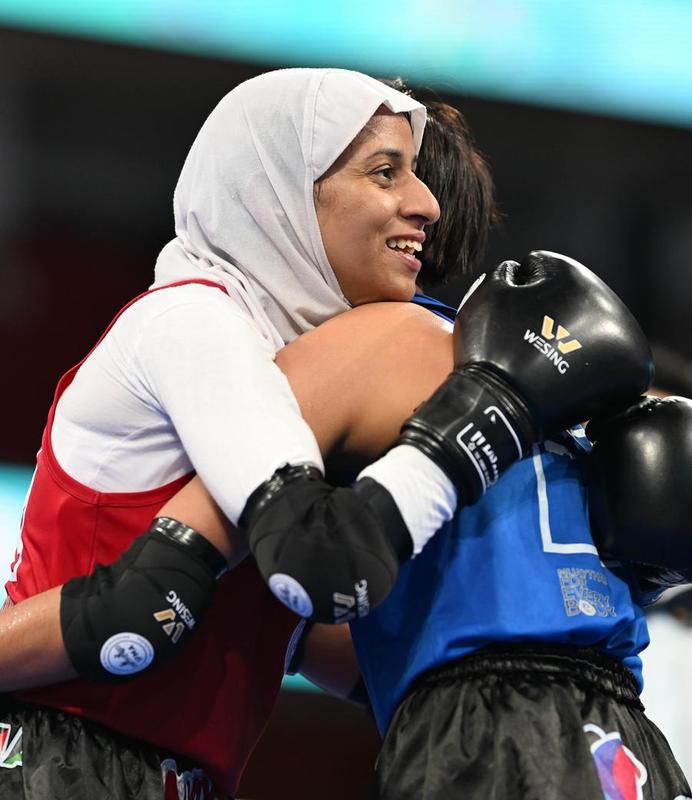 تشنغدو 10 أغسطس 2025 (شينخوا) في الصورة الملتقطة يوم 9 أغسطس 2025، أميمة بلوراث (إلى اليسار) من المغرب تعانق منافستها التايلاندية بعد مباراة نصف النهائي لوزن تحت 48 كغم للسيدات في منافسات المواي تاي ضمن دورة الألعاب العالمية 2025 بمدينة تشنغدو، حاضرة مقاطعة سيتشوان جنوب غربي الصين.