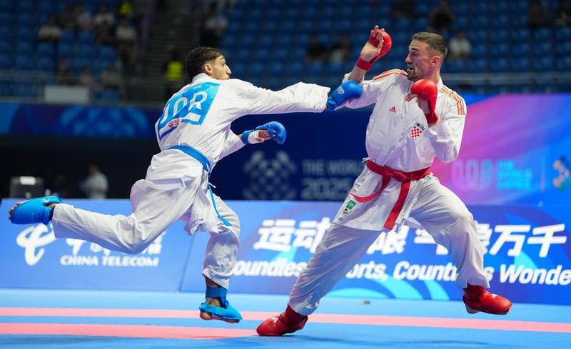تشنغدو 10 أغسطس 2025 (شينخوا) في الصورة الملتقطة يوم 9 أغسطس 2025، محمد فائق محمد الجعفري (إلى اليسار) من الأردن يتنافس مع لاعب كرواتي خلال النزال النهائي على الميدالية الذهبية في منافسات الكوميتيه لوزن تحت 84 كغم للرجال ضمن رياضة الكاراتيه في دورة الألعاب العالمية 2025 بمدينة تشنغدو، حاضرة مقاطعة سيتشوان جنوب غربي الصين.