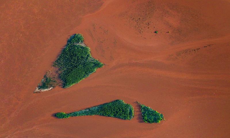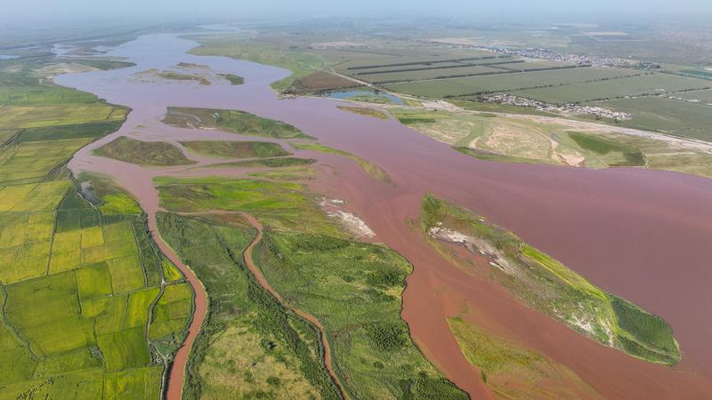 في الصور الملتقطة يوم 6 سبتمبر 2025، جوانب من الأراضي الطينية وحقول الأرز على طول النهر الأصفر في محافظة بينغلوه بمنطقة نينغشيا ذاتية الحكم لقومية هوي بشمال غربي الصين.