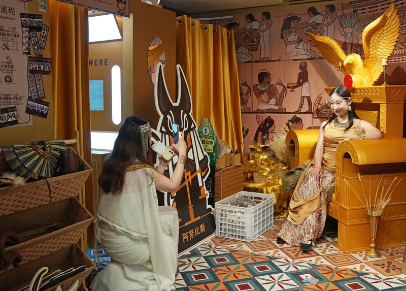 في الصورة الملتقطة يوم 11 أغسطس 2025، زائرة تجلس لالتقاط صور على الطراز المصري في متجر للمنتجات الثقافية والإبداعية في متحف شانغهاي في مدينة شانغهاي شرقي الصين. (شينخوا)
