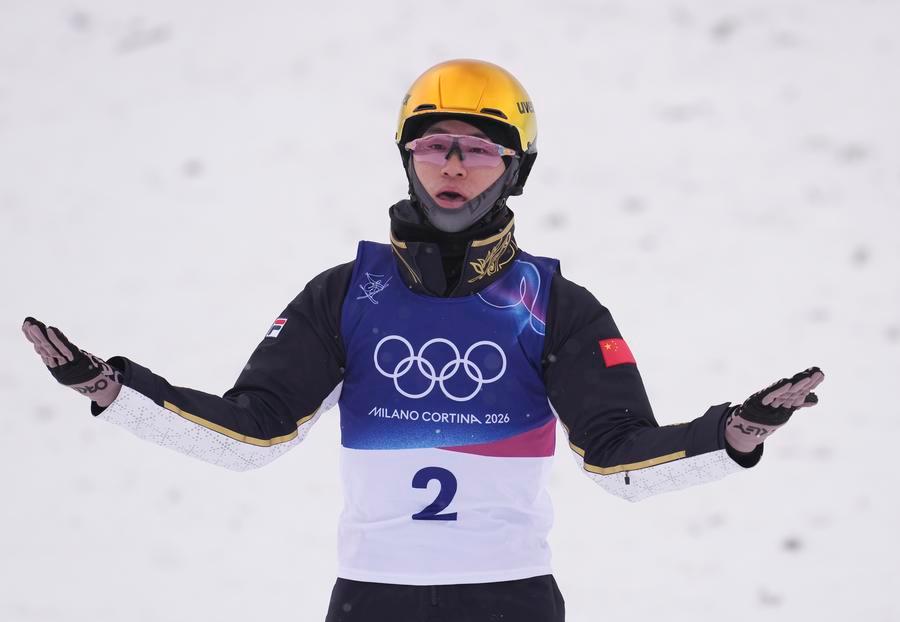 في الصورة الملتقطة يوم 20 فبراير 2026، الصيني، وانغ شين دي، يحتفل خلال الجولة الثانية لنهائي مسابقة القفزات الهوائية في التزلج الحر للرجال، ضمن دورة الألعاب الأولمبية الشتوية ميلانو-كورتينا 2026 في ليفينيو، إيطاليا. (شينخوا)