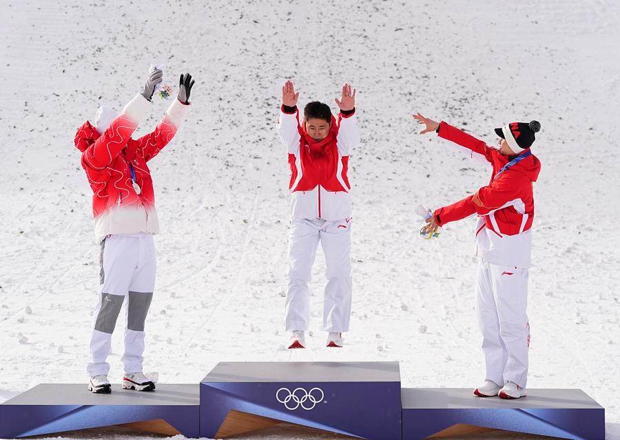 في الصورة الملتقطة يوم 20 فبراير 2026، الصيني، وانغ شين دي (الوسط)، الحائز على الميدالية الذهبية، يقفز على منصة التتويج خلال مراسم توزيع الميداليات عقب مسابقة القفزات الهوائية في التزلج الحر للرجال، ضمن دورة الألعاب الأولمبية الشتوية ميلانو-كورتينا 2026، في ليفينيو، إيطاليا. (شينخوا)