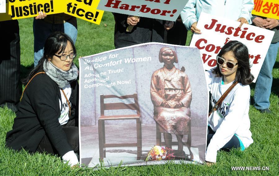 نظم نحو 500 من أفراد الجاليتين الأمريكية الصينية والأمريكية الكورية احتجاجا في سان فرانسيسكو الثلاثاء ضد الجهود المستمرة لرئيس الوزراء اليابانى شينزو آبى لتشويه حقائق التاريخ.
