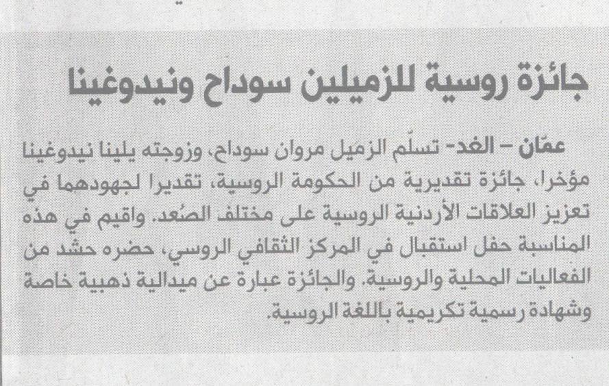 نشرت صحيفة الغد الأردنية خبر تسلم الزميل مروان سوداح، وزوجته يلينا نيدوغينا مؤخراً، جائزة تقديرية من الحكومة الروسية.