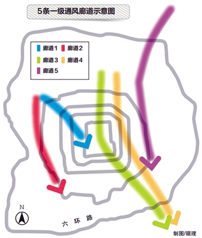 وتخطط بكين لتطوير عدد من الممرات الهوائية من خلال ربط مناطق كبيرة بفضاءات الحدائق والأنهار والأراضي الخضراء، حيث تم تصميم ممرات التهوية الأولية الخمسة لتكون بعرض أكثر من 500 متر، فيما سيتم تخطيط ممرات هوائية ثانوية بعرض أكثر من 80 مترا.