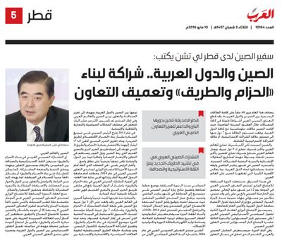 سفير الصين لدى قطر ينشر مقالا في مجموعة من الصحف القطرية بمناسبة انقعاد منتدى التعاون الصيني ـ العربي في الدوحة