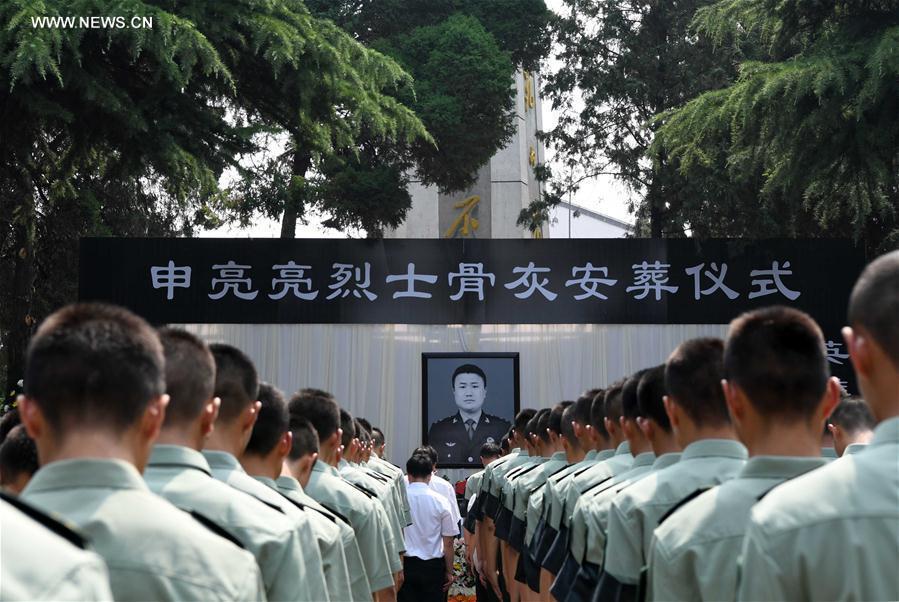 دُفن رماد عظام شن ليانغ ليانغ جندي بقوات حفظ السلام الصينية التابعة للأمم المتحدة الذي قتل في هجوم إرهابي في مالي الشهر الماضي, في مقبرة الأبطال يوم الاثنين في مسقط رأسه في مقاطعة خنان بوسط الصين.