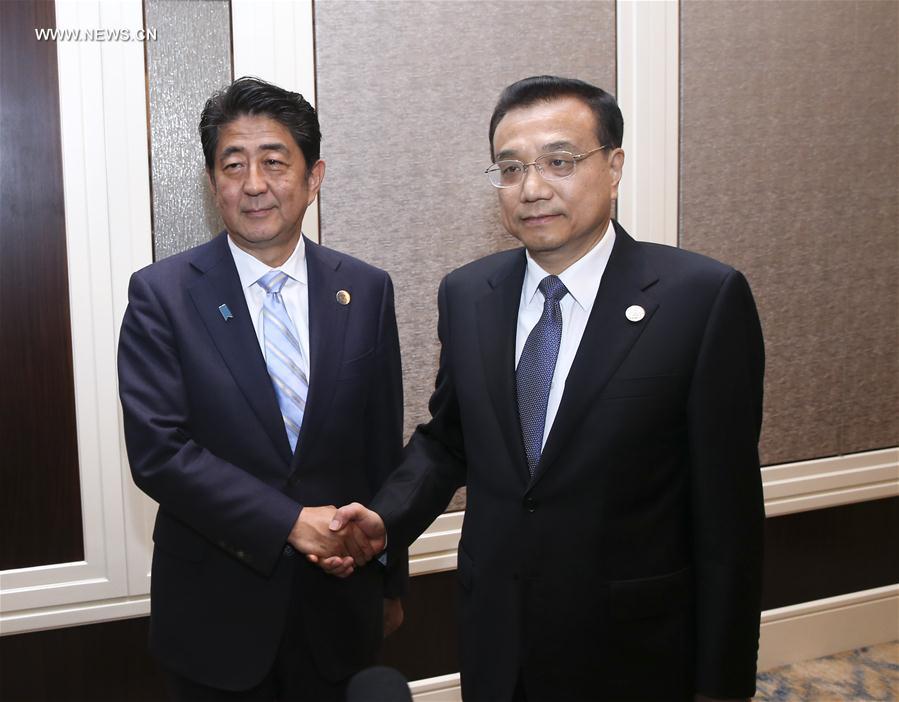 التقى رئيس مجلس الدولة الصيني لي كه تشيانغ بنظيره الياباني شينزو آبي إن في أولان باتور، 15 يوليو. (شينخوا/بانغ شينغ لي)