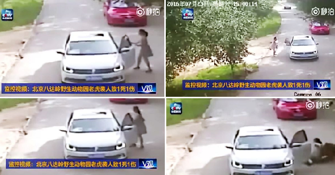 هذا فيديو بائس ودموي، لصينية انقضّ عليها #نمر من حيث لم تحتسب، فجرّها بكل قواه من جوار سيارة كانت تهم بالجلوس في مقعدها الخلفي، وقتلها افتراساً وهي حية تولول وتصرخ بين مخالبه وأسنانه، ومعه ظهر في الميدان نمر ثانٍ ونهش امرأة أخرى أيضاً في حديقة طبيعية للحيوان تقع قرب قسم من “سور الصين العظيم” يسمونه Badaling وهو هناك الجاذب الأكبر للسياح في المنطقة البعيدة 80 كيلومتراً عن العاصمة بيجينغ.
