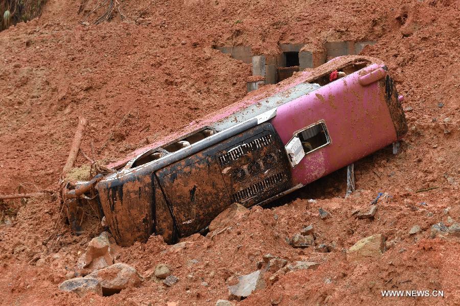 في الصورة الملتقطة يوم 13 أغسطس 2016،دُفنت حافلة على متنها 23 شخصا في انهيار أرضي اليوم السبت في مقاطعة فوجيان بجنوب شرقي الصين.(شينخوا)