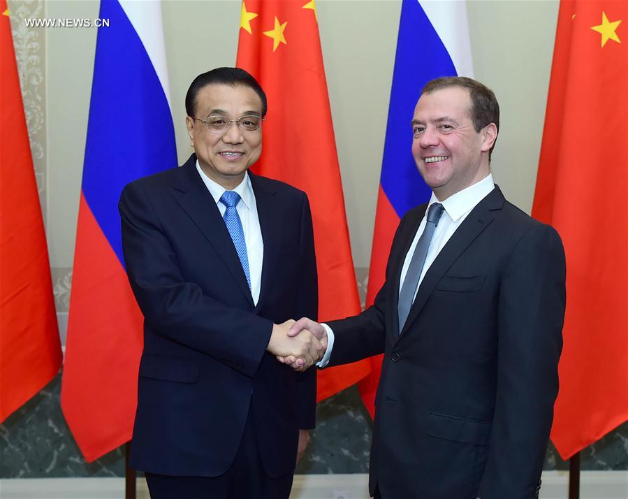 تعهد رئيس مجلس الدولة الصيني لي كه تشيانغ ونظيره الروسي دميتري ميدفيديف يوم الاثنين بتعزيز التعاون العملي بين الجارتين.