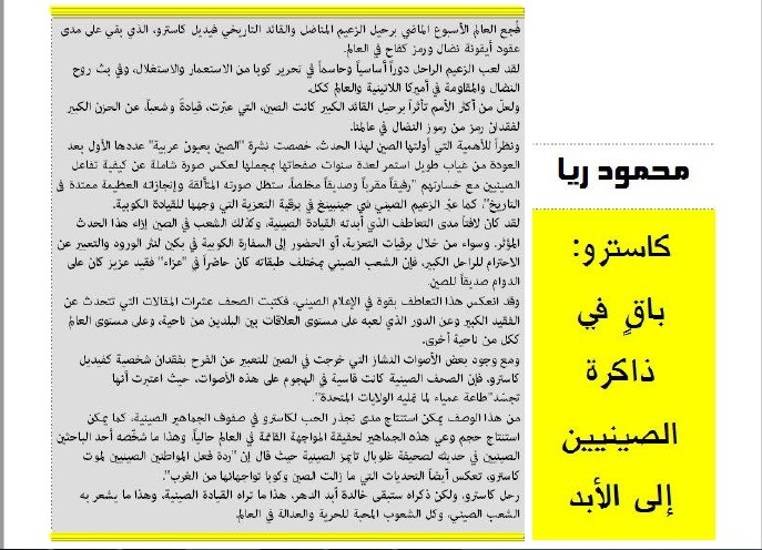 ونظراً للأهمية التي أولتها الصين لهذا الحدث، خصصت نشرة “الصين بعيون عربية” عددها الأول بعد العودة من غياب طويل استمر لعدة سنوات صفحاتها بمجملها لعكس صورة شاملة عن كيفية تفاعل الصينيين مع خسارتهم “رفيقاً مقرباً وصديقاً مخلصاً، ستظل صورته المتألقة وإنجازاته العظيمة ممتدة فى التاريخ”، كما عبّر الزعيم الصيني شي جينبينغ في برقية التعزية التي وجهها للقيادة الكوبية.