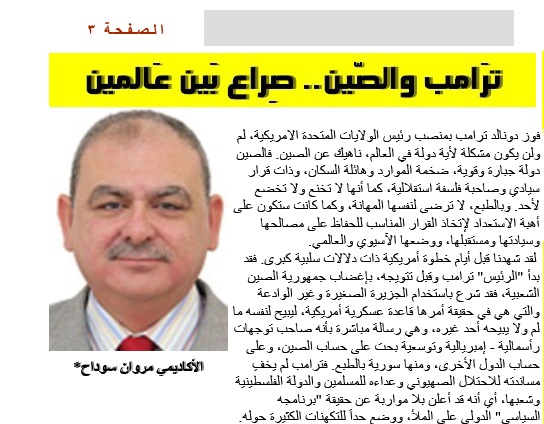 لقد شهدنا قبل أيام خطوة أمريكية ذات دلالات سلبية كبرى. فقد بدأ “الرئيس” ترامب وقبل تتويجه، بإغضاب جمهورية الصين الشعبية، فقد شرع باستخدام الجزيرة الصغيرة وغير الوادعة والتي هي في حقيقة أمرها قاعدة عسكرية أمريكية، ليبيح لنفسه ما لم ولا يبيحه أحد غيره، وهي رسالة مباشرة بأنه صاحب توجهات رأسمالية – إمبريالية وتوسعية بحت على حساب الصين، وعلى حساب الدول الأخرى، ومنها سورية بالطبع. فترامب لم يخفِ مساندته للاحتلال الصهيوني وعداءه للمسلمين والدولة الفلسطينية وشعبها، أي أنه قد أعلن بلا مواربة عن حقيقة “برنامجه السياسي” الدولي على الملأ، ووضع حداَ للتكهنات الكثيرة حوله.