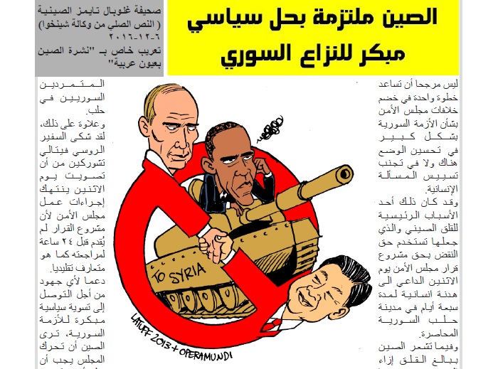 وقد كان ذلك أحد الأسباب الرئيسية للقلق الصيني والذي جعلها تستخدم حق النقض بحق مشروع قرار مجلس الأمن يوم الاثنين الداعي الى هدنة انسانية لمدة سبعة أيام في مدينة حلب السورية المحاصرة.