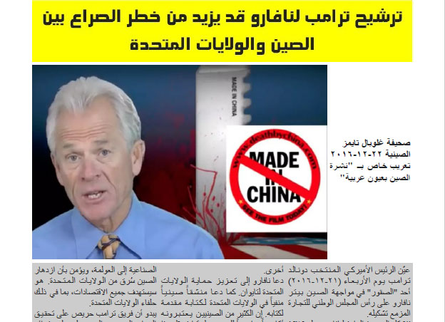 كلف ترامب نافارو بمنصب مهم. وهذا الأمر لا يعني إشارة إيجابية. يجب على الصين أن تواجه حقيقة أن فريق ترامب يتخد مواقف متشددة تجاهها. عليها أن تبدد أي وهم، وأن تتخذ الاستعدادات الكاملة ضد أي تحرك هجومي من قبل حكومة ترامب.اختيار ترامب لنافارو ليس بالضرورة بسبب موقفه المناهض للصين. الهدف الأساسي للرئيس المنتخب هو إنعاش الاقتصاد الأمريكي.