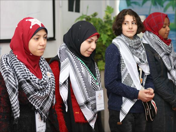 طالبات يلبسن الكوفية الفلسطينية (الجزيرة نت)