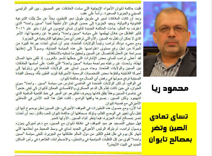 تساي تعادي الصين وتضر بمصالح تايوان (افتتاحية العدد الخمسين)
