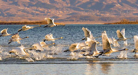 تظهر هذه الصورة حشدا من الطيور تطير فى خزان المياه بمنطقة مييون ببكين.وفى السنوات الأخيرة،عززت بكين جهودها على نحو متزايد لحماية البيئة وقامت بتحديد المناطق المحمية فى خزان المياه بمنطقة مييون،مما يضمن جودة المياه فى المدينة.المصور:خه يونغ،مراسل لصحيفة الشعب اليومية