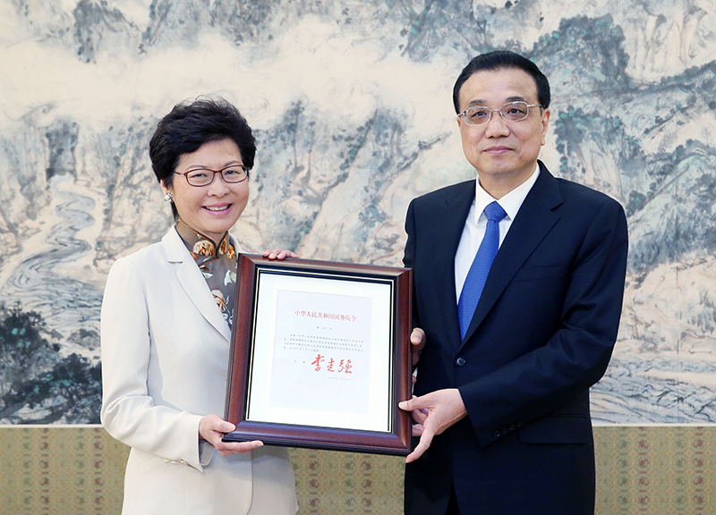 رئيس مجلس الدولة الصيني يمنح شهادة تعيين للرئيسة التنفيذية الجديدة لمنطقة هونغ كونغ