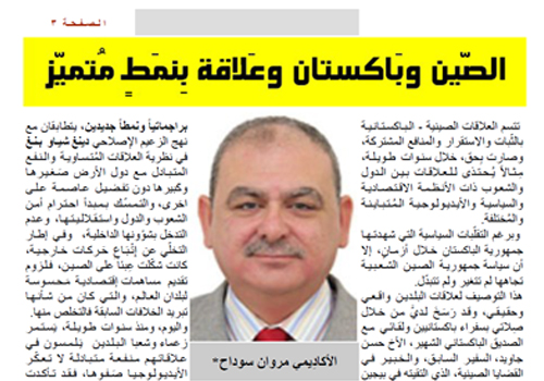 هذا التوصيف لعلاقات البلدين واقعي وحقيقي، وقد رَسَخَ لديَّ من خلال صِلاتي بسفراء باكستانيين ولقائي مع الصديق الباكستاني الشهير، الأخ حسن جاويد، السفير السابق، والخبير في القضايا الصينية، الذي التقيته في بيجين بمؤتمر “قادة الرأي الأجانب خلال رحلة إبداعية الى الصين“، بدعوة من إذاعة الصين الدوليةCRI، في نوفمبر2016م.