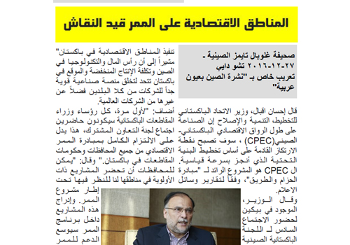 وقال الوزير، الموجود في بيكين لحضور الاجتماع السادس لـ اللجنة الباكستانية الصينية المشتركة للتعاون حول الممر الاقتصادي في مقابلة حصرية لصحيفة غلوبال تايمز: “ما يصل لثماني مناطق صناعية ل CPEC هي قيد المناقشة الأولية، وستكون بمعدل منطقة واحدة لكل محافظة ومنطقة خاصة من باكستان، ونأمل أن هذا سيكون السبيل الجديد للتعاون بين الصين و باكستان”.