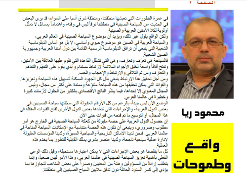 ولكن الواقع يقول غير ذلك، ويزيد أن موضوع السياحة الصينية في العالم العربي، والسياحة العربية في الصين هو موضوع حيوي وأساسي، لا بل هو أساس الدبلوماسية الشعبية التي ينبغي أن ترافق الدبلوماسية الرسمية القائمة بين دول أمتنا العربية وجمهورية الصين الشعبية.