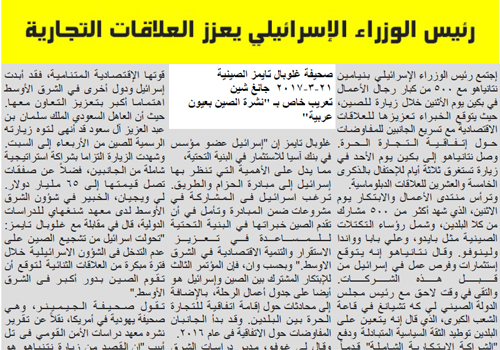 تقول صحيفة الجيمينر، وهي صحيفة يهودية في أمريكا، نقلاً عن تقرير نشره معهد دراسات الأمن القومي فى تل أبيب “إن القصد من زيارة نتنياهو هو تعريف العلاقة بين إسرائيل والصين باعتبارها “شراكة مبتكرة شاملة”، وهو تعريف يعبر عن فهم الجانبين لمركز الثقل في علاقاتهما”.