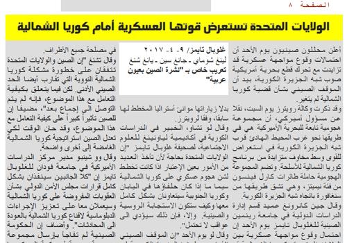 وقال جين “لقد أظهر الرئيس الامريكي دونالد ترامب أن الولايات المتحدة أكثر عزما الآن على استخدام القوة العسكرية بعد أن هاجمت سوريا ب 59 صاروخ يوم الجمعة”. وأضاف إن الغرض من هذه الخطوة الأمريكية هو دفع الصين للتعاون معها في موضوع كوريا الشمالية.