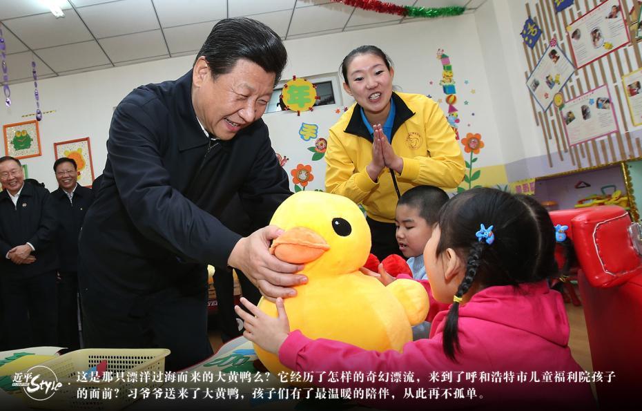 إهداء الرئيس الصين شي جين بينغ لعبة إلى طفل فى روضة رعاية الأطفال فى مدينة هوهيهوت.