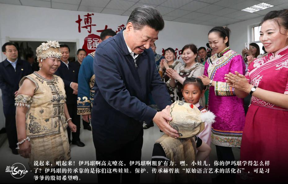الرئيس الصيني شي جين بينغ يشجع طفلا على ممارسة فن”ييماكان”وهو فن الراب لقومية خهتشي بشمال شرق الصين.