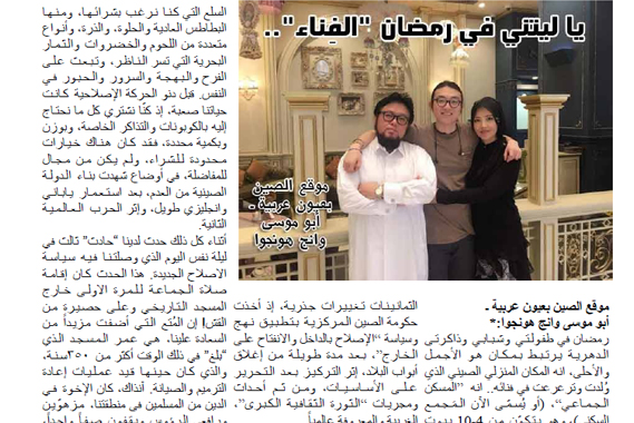 أذكر وقتها مظاهر سعيدة لاحتفالنا بشهر رمضان المبارك، فقد شاركنا الاحتفال والفرحة إخوتنا من الصينيين غير المسلمين، وكان الأمر بمثابة لوحة جميلة وأخّاذة تعرض للشعب الصيني الواحد والموحَّد، فجيراننا القريبون وأصدقاؤنا البعيدون شاركونا الفرح برمضان، واجتمعوا تحت سقف واحد، بدون أيّة موانع وحواجز، وتبادلوا معنا أطراف الحديث عن كل شيء، ابتداءً من شؤون وشجون الحياة والدين، إلى العلوم والجغرافيا، ورؤى في المستقبـل الوطنـي.