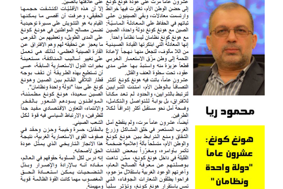 عشرون عاماً مرّت على عودة هونغ كونغ إلى حضن الوطن الأم، تغيّرت فيها خرائط وارتسمت معادلات، وبقي الصينيون على ثباتهم في الحفاظ على المعادلة الماسيّة: الصين مع هونغ كونغ دولة واحدة، الصين مع هونغ كونغ نظامان ليسا نظاماً واحداً.
