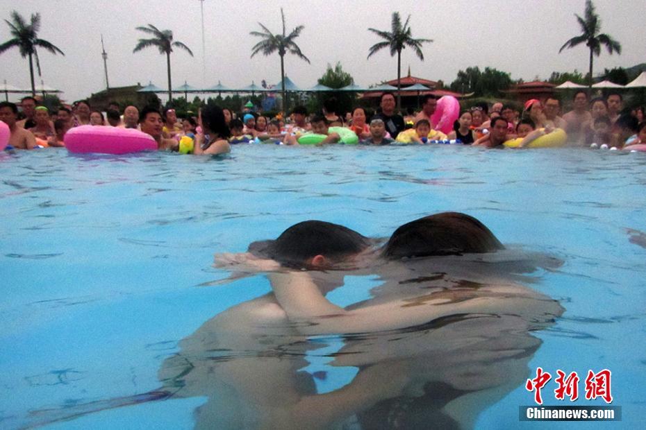 أقيمت مسابقة التقبيل تحت الماء فى احد المنتزهات المائية بمدينة نانجينغ،شرقي الصين يوم 19 أغسطس الحالي،وقد جذبت المسابقة مشاركة الكثير من الزوار المتواجدين في المنتزه ،حيث قفزوا المنافسون فى الماء وقاموا بالقبلات الساخنة تحت الماء.