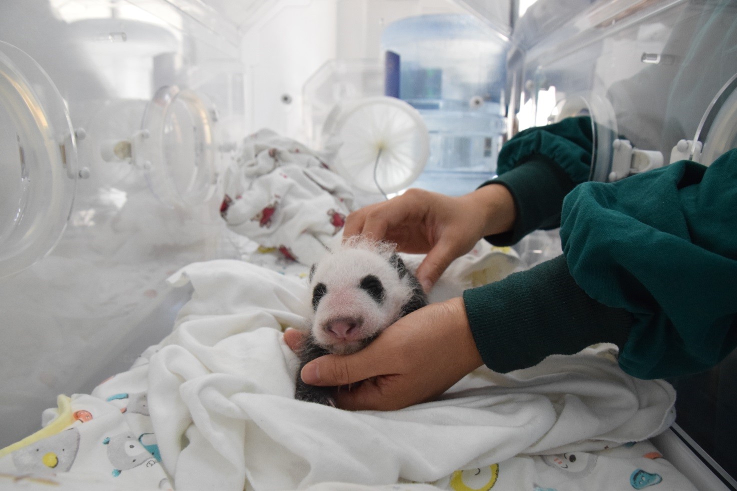 صورة: موظف يفحص شبل الباندا حديث الولادة.