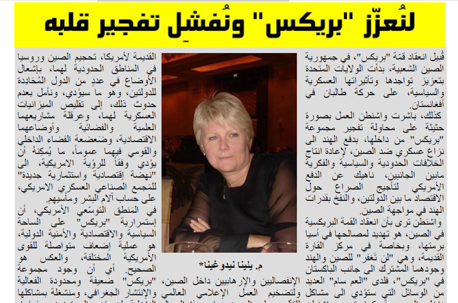 *عضو في المجلس القيادي التنفيذي للاتحاد الدولي للصحفيين والإعلاميين والكتّاب العرب أصدقاء وحُلفاء الصين ورئيسة تحرير الملحق الروسي.
