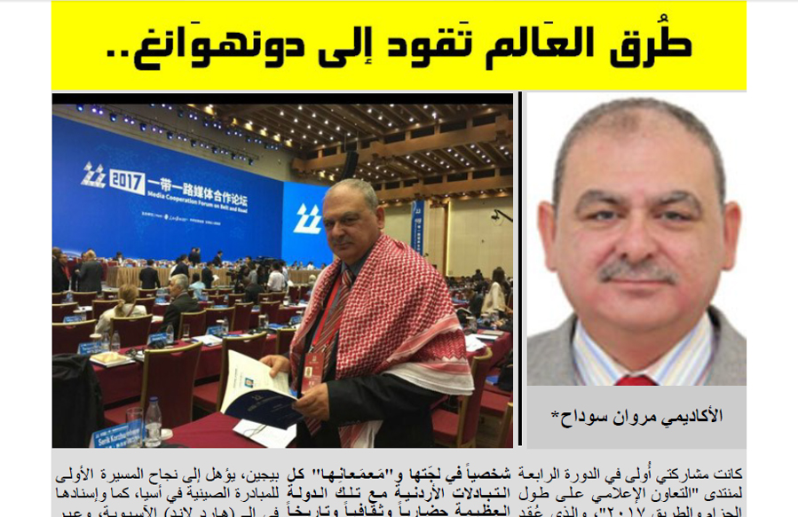 كانت مشاركتي أُولى في الدورة الرابعة لمنتدى “التعاون الإعلامي على طول الحزام والطريق 2017″، والذي عُقد تحت شعار “مَصير مُشترك وآفاق جديدة للتعاون”، يوم التاسع عشر من أيلول/ سبتمبر الحالي، في مدينة دونهوانغ، بمقاطعة قانسو، واستمر عدة أيام، إضافة نوعية لعلاقاتي القديمة جداً مع الصين، والتي تمتد لنحو خمسين سنة. زرتُ الصين عشرات المرات، وقد أكون المواطن الأردني الوحيد الذي زار تلك البلاد الحليفة أكثر من زياراته لقرى الأردن ومُدنه، فقد كنتُ نَسجتُ هذه العلاقات مع المؤسسات الصينية، وبخاصة القسم العربي لإذاعة الصين الدولية (CRI)، بحدبٍ ومساندة ومساعدة وتشجيع من لدنِ والدي المرحوم موسى سوداح (المُحب للصين وجَامع الكتب عنها)، ويبدو اليوم كم كانت خطواتي الأولى، خطوات الألف ميل الاولى مع الصين، مهمة ونافعة وذات مستقبل واعد على مختلف الصُعد، ضمن سياقات الدبلوماسية الشعبية، إذ كنت طرقتُ بابها قبل تأسيس العلاقات الدبلوماسية بين بلدينا، وفي هذا بالذات، فقد سبقتُ شخصياً في لجّتها و”مَعمَعانِها” كل التبادلات الأردنية مع تلك الدولة العظيمة حضارياً وثقافياً وتاريخاً وشعباً.