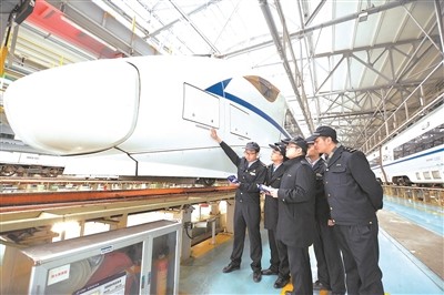 الميكانيكيون العاملون على متن القطارات فائقة السرعة يشاركون في التدريب.(المصدر” الموقع الرسمي لشركة السكك الحديدة الصينية العامة)