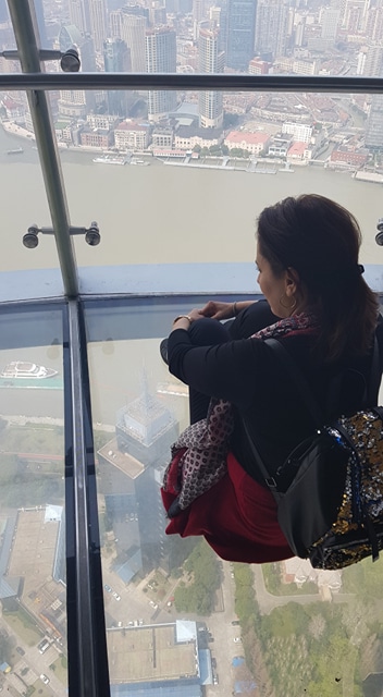 ومن أكثر الفضاءات إثارة، الفضاء البلوري دائري الشكل، الذي يُتيح للزوار الفرصة للتمتع بإطلالة بانورامية على كامل مدينة شنغهاي، وبمشهد غير عادي، فما أن تطأ قدماك الأرضية الشفّافة، يختلجك الإحساس بأنك ستسقط إلى تحت لا محالة، وتقع في هوةٍ عميقة، فيمتلكك شعور مذهل بالرهبة والرعشة والخوف الشديد، قبل أن يتحوّل بعد لحظات معدودة إلى إحساس معاكس تماماً، إحساس جذّاب ومُثير ومبهج .. فتشعر بنصر.. وتشعر بقهر المستحيل!