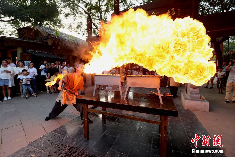 يظهر في الصورة الملتقطة ليلة 2 أغسطس الجاري، رجل بصدد شواء لحم الخروف من خلال النار التي ينفثها من فمه، في إحدى الأسواق الليلية الأكثر شعبية في مدينة كايفونغ بمقاطعة خنان. وجذبت هذه الطريقة الإستثنائية في الشواء أنظار عدد كبير من الزائرين.