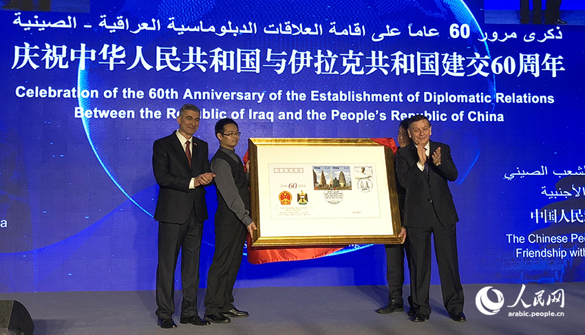 وشهد الحفل ازاحة الستار عن الظرف التذكاري والطابع البريدي اللذين يرمزان إلى الذكرى الستين لإقامة العلاقات الدبلوماسية بين الصين والعراق. وتبادل الطرفان الهدايا وقطع الكعكة التذكارية.