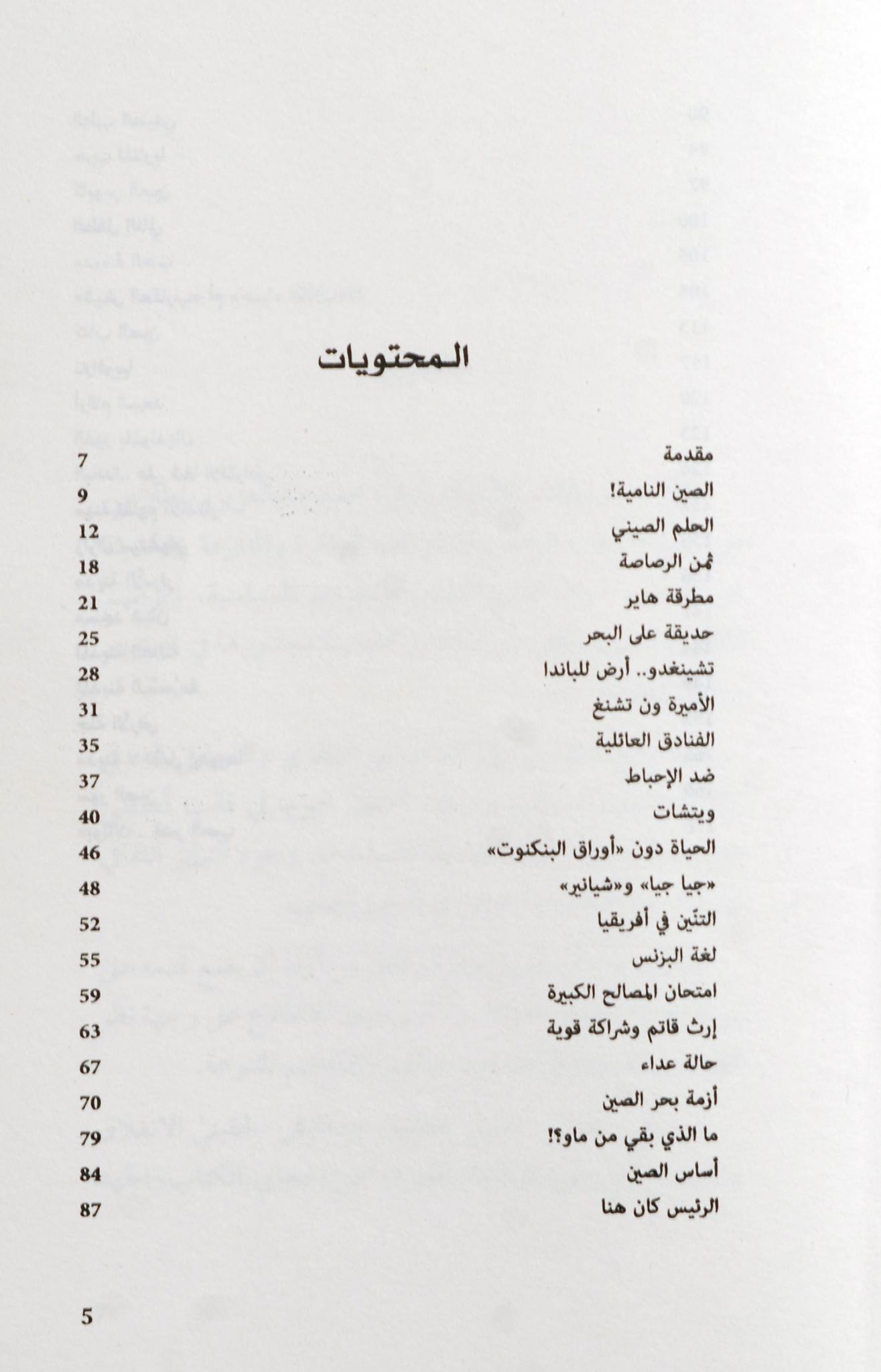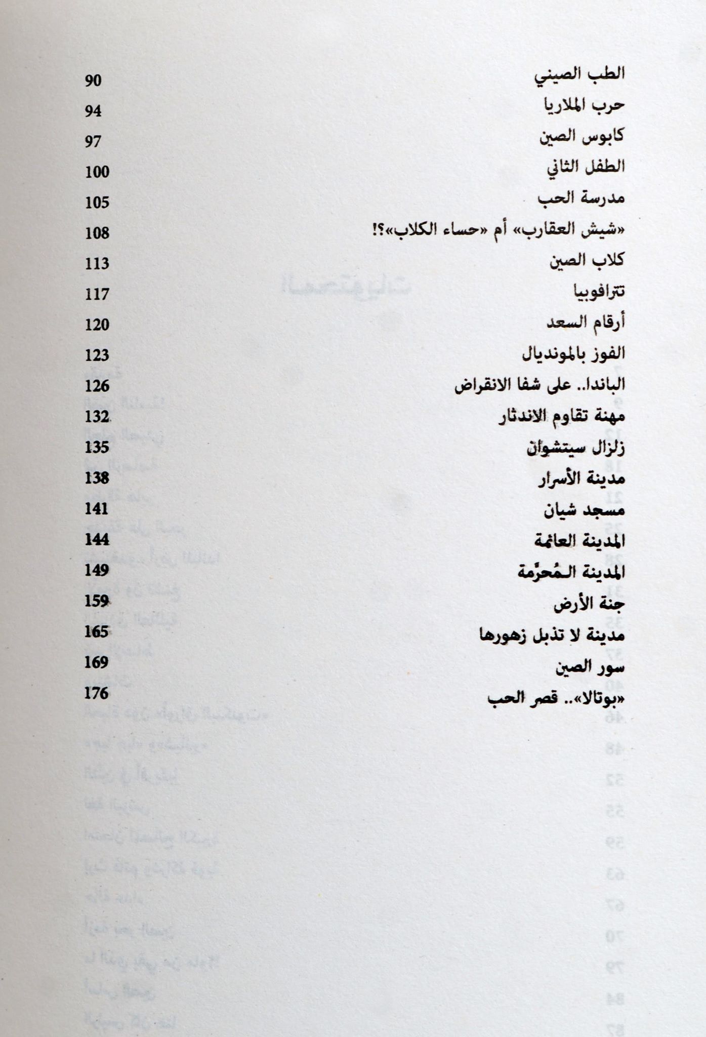 وتتضمن محتويات الكتاب عناوين لافتة تتطرق الى الحُلم الصيني، والصين النامية، ولغة البزنس، وأزمة بحر الصين، والطب الصيني، وسور الصين وغيرها العشرات من العناوين الشيقة.