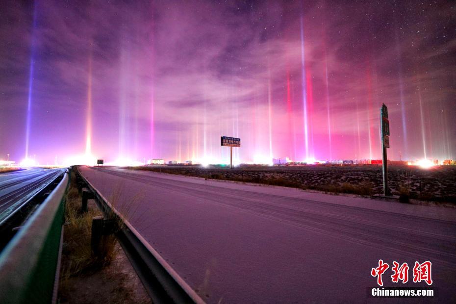 ظهرت أعمدة شمسية كثيفة في بلدة تشاكا بولاية هايشي التابعة لمقاطعة تشينغهاي شمال غربي الصين في فجر يوم 13 ديسمبر الحالي،ما شكل منظرا رائعا يشبه أفلام الخيال العلمي.وقد جذب هذا المنظر النادر العديد من المصورين.