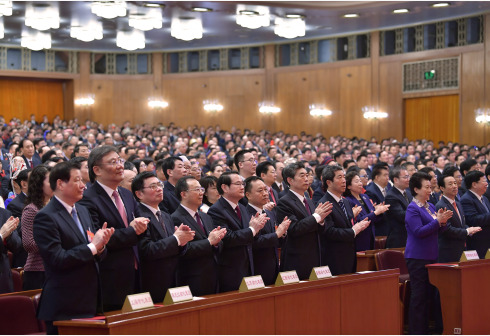 وحضر شي جين بينغ والقادة الصينيون الآخرون: لي كه تشيانغ ووانغ يانغ ووانغ هو نينغ وتشاو له جي وهان تشنغ ووانغ تشي شان الجلسة الختامية في قاعة الشعب الكبرى في بكين.