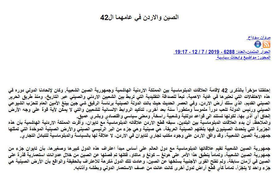 إحتفلنا مؤخراً بالذكرى 42 لإقامة العلاقات الدبلوماسية بين المملكة الاردنية الهاشمية وجمهورية الصين الشعبية. وكان لإتحادنا الدولي دوره في هذه الاحتفالات التي نعتبرها في غاية الاهمية، تبعاً للصداقة التقليدية التي تربط بين الشعبين الاردني والصيني عبر التاريخ، ومنذ طريق الحرير الصيني القديم، الذي سلك أرض الاردن، وفي العصر الحديث حيث باتت الدولة الصينية برئاسة الرفيق شي جين بينغ الأمين العام للحزب الشيوعي الصيني ورئيس الدولة تلعب دوراً ملموساً ومتطوراً سنة بعد أخرى، لتأكيد الروابط الانسانية للشعبين والتي لا يمكن لأية قوة على وجه الأرض إلحاق أي أذى بها، لكونها تستند الى قواعد دولتية وشعبية راسخة, ومعنى سياسي واقتصادي وبشري عميق.
