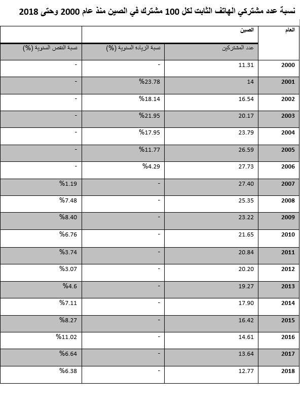 وتحقيقا لمكافحة الاحتكار في الصين واتهام China Telecom بالهيمنة على السوق والتلاعب في أسعار الخطوط الثابتة، وبمناسبة أول استخدام لقانون مكافحة الاحتكار ضد مؤسسات الدولة عام 2008 فقد تم السماح للشركات المنافسة للوصول لبُنيتها التحتية، ويمكن للعملاء الاختيار من بين 20 مزودي خدمة، ولكن لهم فقط 10% من حصة السوق. بينما يكون ارتفاع سعر شبكة الجيل الثالث 3Gقد أدى إلى بطء في إقبال المستخدمين عليها، وبالأخص مستخدمي شبكات التواصل الاجتماعي، حيث يمكنهم تبادل الرسائل بتكلفة أقل عبر شبكة الجيل الثاني 2G وهي تمثل 31% ل MOBILE internet acces لعام 2013. وفي مايو 2014 أذنت الحكومة الصينية رسمياً بضبط تسعيرة الخدمات وفقا لقوى السوق مما أدى إلى خفض الأسعار. (China, 2015)(5) وانخفاض عدد مشتركي الهاتف الثابت في الصين، كما هو موضح من خلال الجدول التالي التفاوت الذي حدث لنسبة عدد خطوط الهاتف الثابت، لكل 100 شخص في الصين، خلال الفترة من 2000 وحتى 2018، مع نسبة الزيادة والنقص السنوية (%). فنجد أن الصين وصلت نسبة النمو 58.72% حيث زاد عدد مشتركي الهاتف الثابت منذ عام 2000 وحتى عام 2006، ومنذ عام 2007 بدأ منحدر الهبوط. فبدأ مشوار النمو في الصين من 14 عام 2000 إلى أن وصل إلى 12.77 عام 2018. (Fixed-telephone subscriptions per 100 inhabitants)(6)