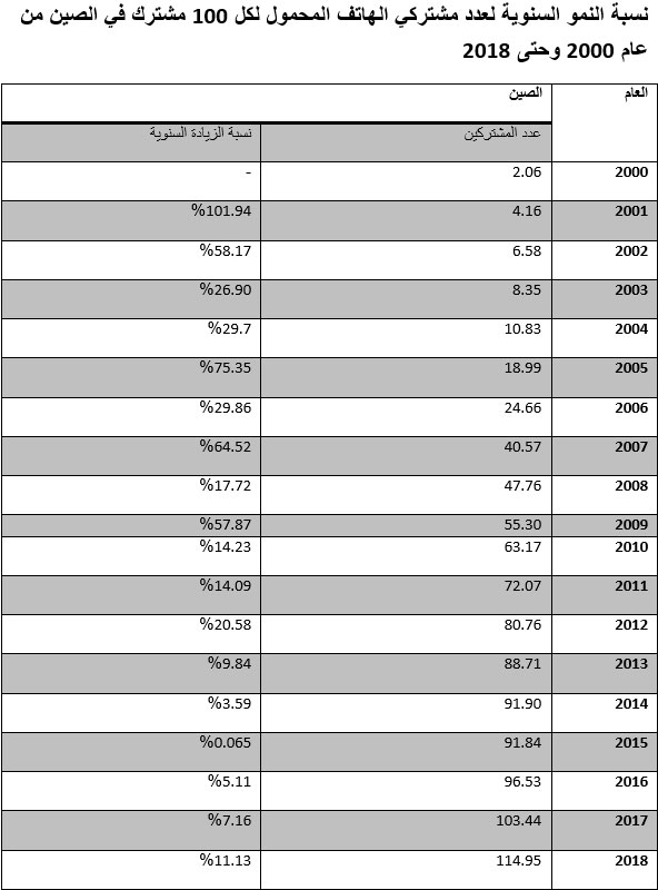 أما بالنسبة للهاتف المحمول، فحدثت طفرة كبيرة في زيادة عدد مستخدمي الهاتف المحمول في الصين منذ عام 2000 وحتى عام 2018، ويتضح من خلال الجدول التالي زيادة نسبة اشتراكات الهاتف المحمول لكل 100 شخص، مع نسبة الزبادة السنوية (%). فلقد بلغت نسبة النمو في الصين 4500.97%. فزاد عدد مستخدمي الهاتف المحمول من 2.06 عام 2000 الى 114.95 عام 2018 ويوضح الجدول الوارد أدناه، الزيادة السنوية لعدد مشتركي الهاتف المحمول في الصين. (Mobile-cellular telephone subscriptions per 100 inhabitants)(7)