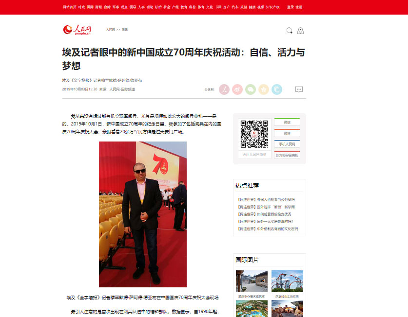 لم يكن في مخيلتي يومًا أن القدر سوف يكتب لي حضور عرض عسكري في حياتي الصحفية، وأن تكون المرة الأولى لي في عرض بهذا الحجم الضخم من التطور، إنه عرض جيش التحرير الشعبي الصيني، الذي تم في صباح يوم الثلاثاء الماضي الأول من أكتوبر 2019، احتفالا بالذكرى السبعين لتأسيس جمهورية الصين الشعبية، حيث مرت تشكيلات تجاوز عددها قرابة 15 جندي ميدان تيان آن من بخلاف تشكيلات الضباط والمدنيين كي يصل العدد الإجمالي 100 ألف شخص.