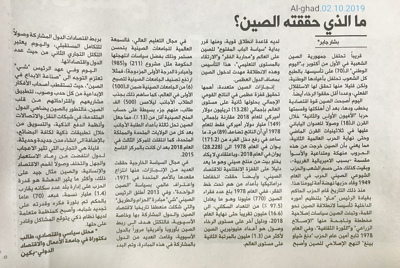 جريدة الغد الاردنية، الثاني من أكتوبر تشرين الاول ٢٠١٩م
